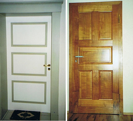 Bei den beiden hier abgebildeten Türen handelt es sich jeweils um Altbestand, der nach Kundenwunsch entsprechend wieder neu aufgearbeitet wurde (weiß-grau lackiert und Kirsche geölt).