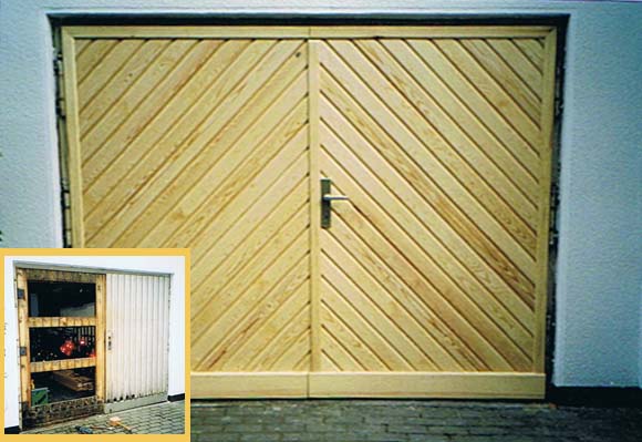 Die Bekleidung eines zweiflügligen Garagentores war schadhaft, die Rahmenkonstruktion der Türen aber noch weiter zu verwenden.