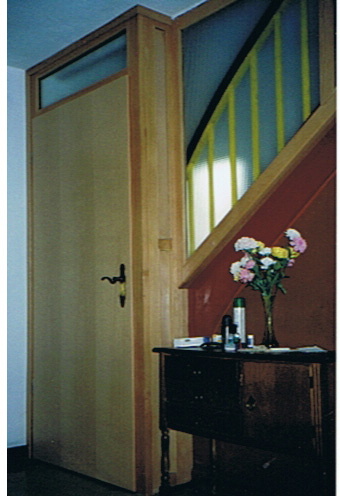 Die vorhandene Treppe wurde aus Gründen des Wärmeschutzes zum Flur im Erdgeschoss mit einer Konstruktion aus einer Tür, einem Oberlicht und einer dreieckigen Festverglasung abgeschottet, alle Elemente wurden auf Maß hergestellt.