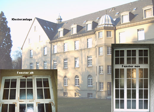 Im Rahmen einer Grundsanierung bekam die Aula dieser Klosteranlage insgesamt 14 neue Fenster (Wiener Sprosse, dreiteilig mit je zwei Flügeln und einem Oberlicht), je Fenster mit einem Maß von ca. 1,90 x 2,70 Meter.